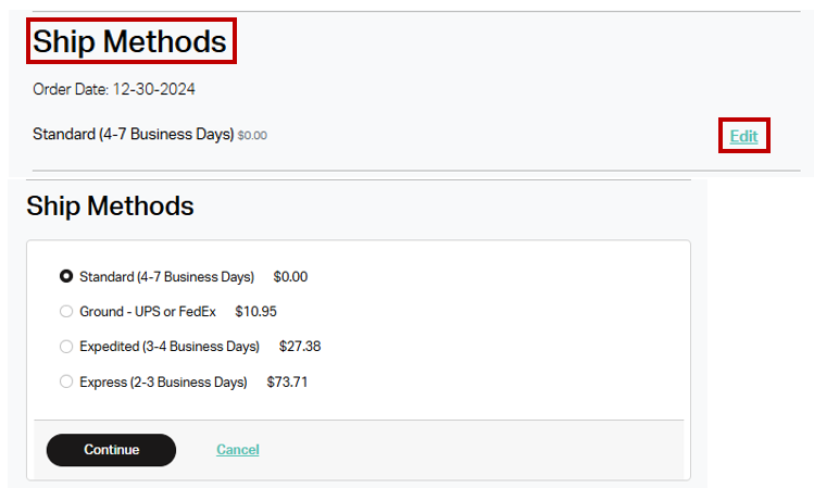 Step 7: Shipping will default to Standard Shipping (4-7 business days). If you would like to update the shipping timeframe, click on the “Edit” button to select Expedited (3-4 business days) or Express (2-3 business days) and click “Save”.