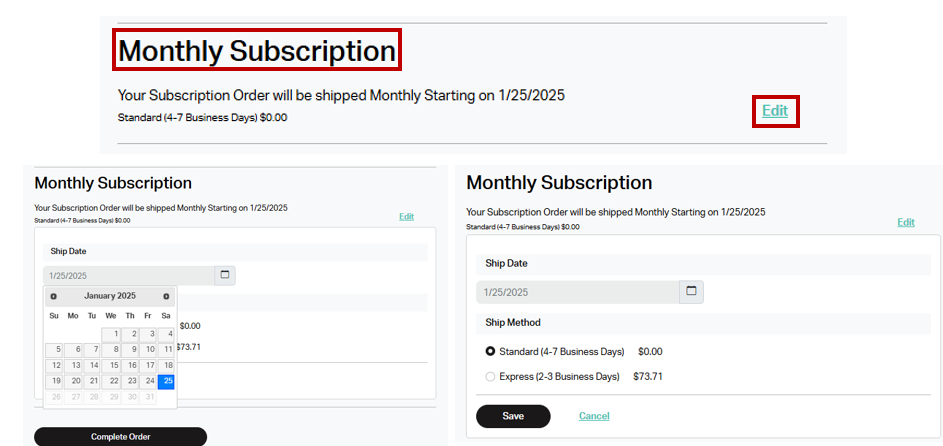 Step 9: If you would like to change the date your Subscription processes, click on “Edit” under the Monthly Subscription section. Click the date you would like the Subscription to process (between the 1st and 25th of the month) it will update on the Monthly Run Date field. You can also select the shipping method for the Monthly Subscription. If everything looks good, click the “Save” button.